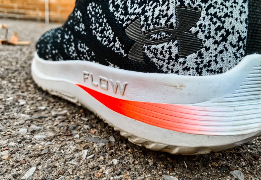 A single piece, flexible knit material is used in the latest version as UA decided to move away from the WARP technology. WARP was a thinner, nylon material with “tape’ overlays across the shoe that was designed to secure your foot and prevent unwanted movement. I didn’t have any issues with movement in the knit material and really liked the black and gray speckled design.