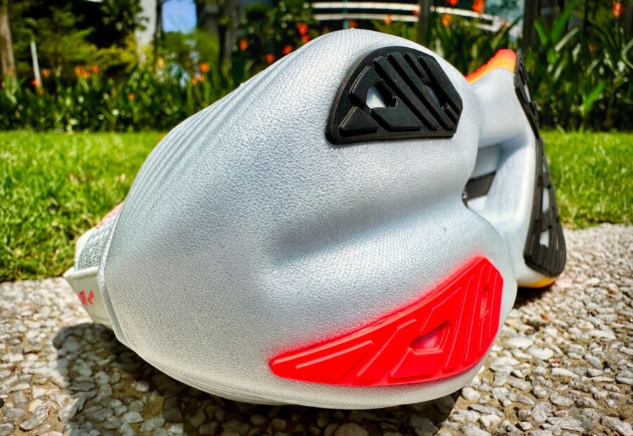 The forefoot rubber section has large holes in it and mimics the carbon plate to save weight. 2 small rubber pads protect the medial and lateral sections of the heel. I used the Hyperion Elite 4 in some light rain and outsole traction was good.